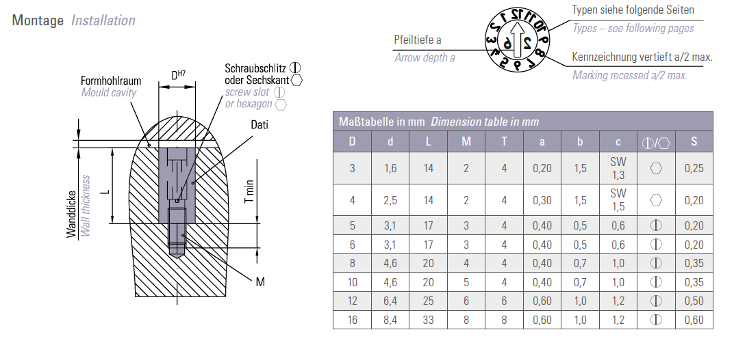 Datomærkning fra Opitz Dati 1200-serien med quick-change af den ønskede markering - en simpel justering på pile-indsatsen ændrer mærkningen. Dati 1200-datomærkninger giver en lille højdeforskel ved justering på pile-indsatsen. Datomærkningen kan monteres fra forsiden med det udvendige gevind.Materiale: 1.4034 (rustfri) 56±2 HRCTekstretning: Spejlvendt og nedsænket