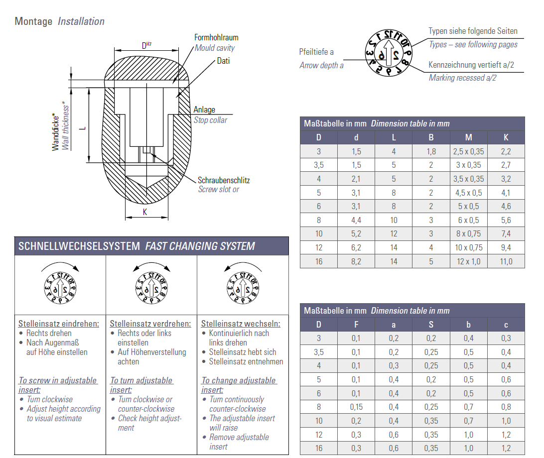 Datomærkning fra Opitz Dati 1800-serien med quick-change af den ønskede markering - en simpel justering på pile-indsatsen ændrer mærkningen. Dati 1800-datomærkninger giver en lille højdeforskel ved justering på pile-indsatsen. Datomærkningen er ekstrem kompakt og monteres fra forsiden med det udvendige gevindMateriale: 1.4034 (rustfri) 56±2 HRCTekstretning: Spejlvendt og nedsænket