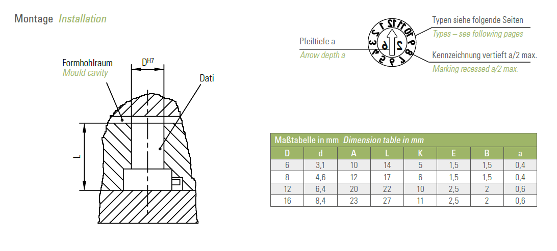 Datomærkning fra Opitz Dati 2100-serien med quick-change af den ønskede markering - en simpel justering på pile-indsatsen ændrer mærkningen. Dati 2100-datomærkninger giver ingen højdeforskel ved justering på pile-indsatsen. Datomærkningen har hoved og kan låses ved den medfølgende stift.Materiale: 1.4034 (rustfri) 56±2 HRCTekstretning: Spejlvendt og nedsænket
