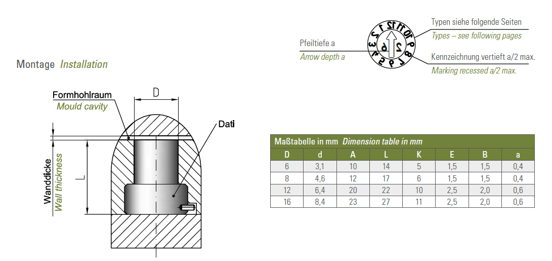 Datomærkning fra Opitz. Opitz Dati 21900-serien med quick-change af den ønskede markering - en simpel justering på pile-indsatsen ændrer mærkningen. Dati 21900-datomærkninger giver ingen højdeforskel ved justering på pile-indsatsen. Datomærkningen har hoved og kan låses ved den medfølgende stift.Materiale: 1.4034 (rustfri) 56±2 HRCTekstretning: Spejlvendt og nedsænket