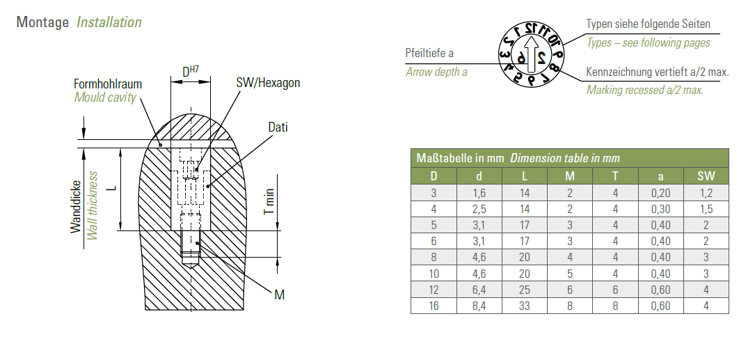 Datomærkning fra Opitz Dati 2200-serien med quick-change af den ønskede markering - en simpel justering på pile-indsatsen ændrer mærkningen. Dati 2200-datomærkninger giver ingen højdeforskel ved justering på pile-indsatsen. Datomærkningen kan monteres fra forsiden med det udvendige gevind.Materiale: 1.4034 (rustfri) 56±2 HRCTekstretning: Spejlvendt og nedsænket