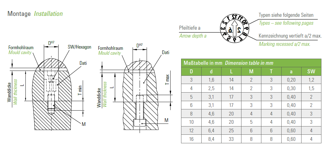 Datomærkning fra Opitz Dati 2900-serien med quick-change af den ønskede markering - en simpel justering på pile-indsatsen ændrer mærkningen. Dati 2900-datomærkninger giver ingen højdeforskel ved justering på pile-indsatsen. Datomærkningen kan blandet andet monteres fra forsiden.Materiale: 1.4034 (rustfri) 56±2 HRCTekstretning: Spejlvendt og nedsænket